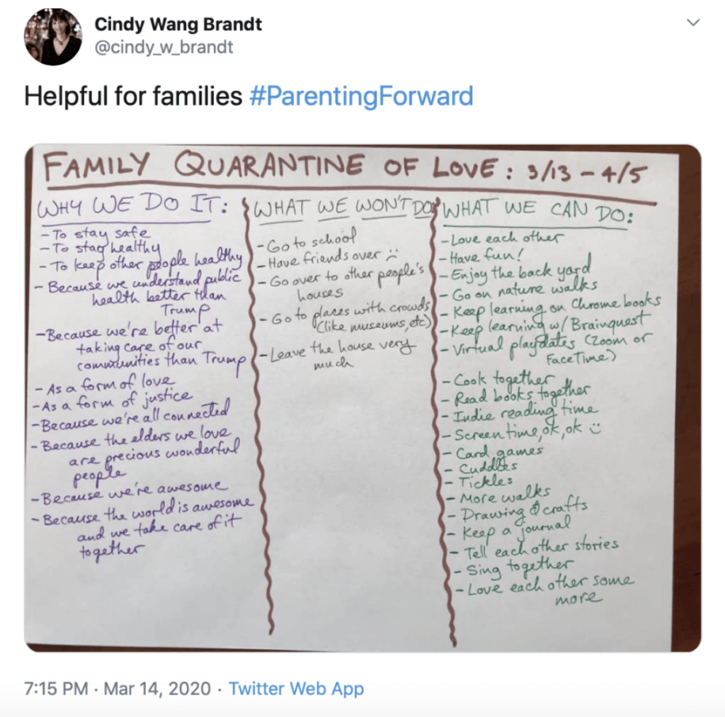 Author Cindy Wang Brant posted an image of this brainstorming exercise a family did with “Family Quarantine of Love” written on top to remind them that these sacrifices are acts of love.