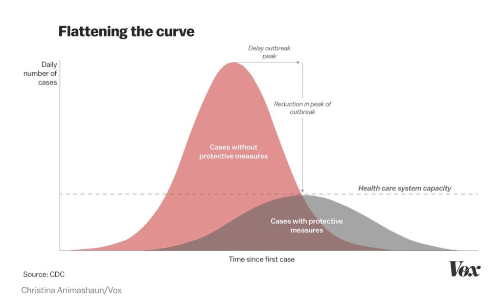 It’s now too late to stop the spread of the corona virus, so we need to take every precaution to SLOW the spread. When people use the phrase “Flatten the Curve,” they’re talking about a graph representing the number of daily cases over time. This graph from the CDC illustrates the goal of social distancing: a reduction in the outbreak’s peak. We want to slow the spread of the virus, so a sudden increase doesn’t overwhelm our ability to respond.