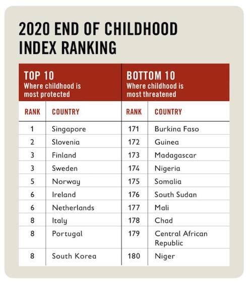 With possible points from 1-1,000, with 1,000 being the best possible scenario for children, the country scores measure the extent at which children living in their respective nations experience childhood enders, or situations which cause death or cause a child to have to enter adult roles too soon. Out of 180 countries this year the actual scores ranged from Singapore with the highest score of 989, where kids are more likely to experience an ideal childhood, to Niger with the lowest score of 375, where children are most likely to experience an early death or difficult living situations.