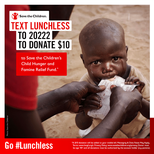 What if each of us gave up our lunch for one day? Save the Children is asking us to go #Lunchless to experience what it might feel like to go without by missing a meal. If for one day this week each of us went #Lunchless and donated our lunch money to Save the Children instead, we could save lives. Each #lunchless donation to East Africa Child Hunger Crisis & Famine Relief Fund is being matched by two separate anonymous donors up to $150,000 further amplifying each gift.